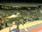 A gymnast crashes into the apparatus